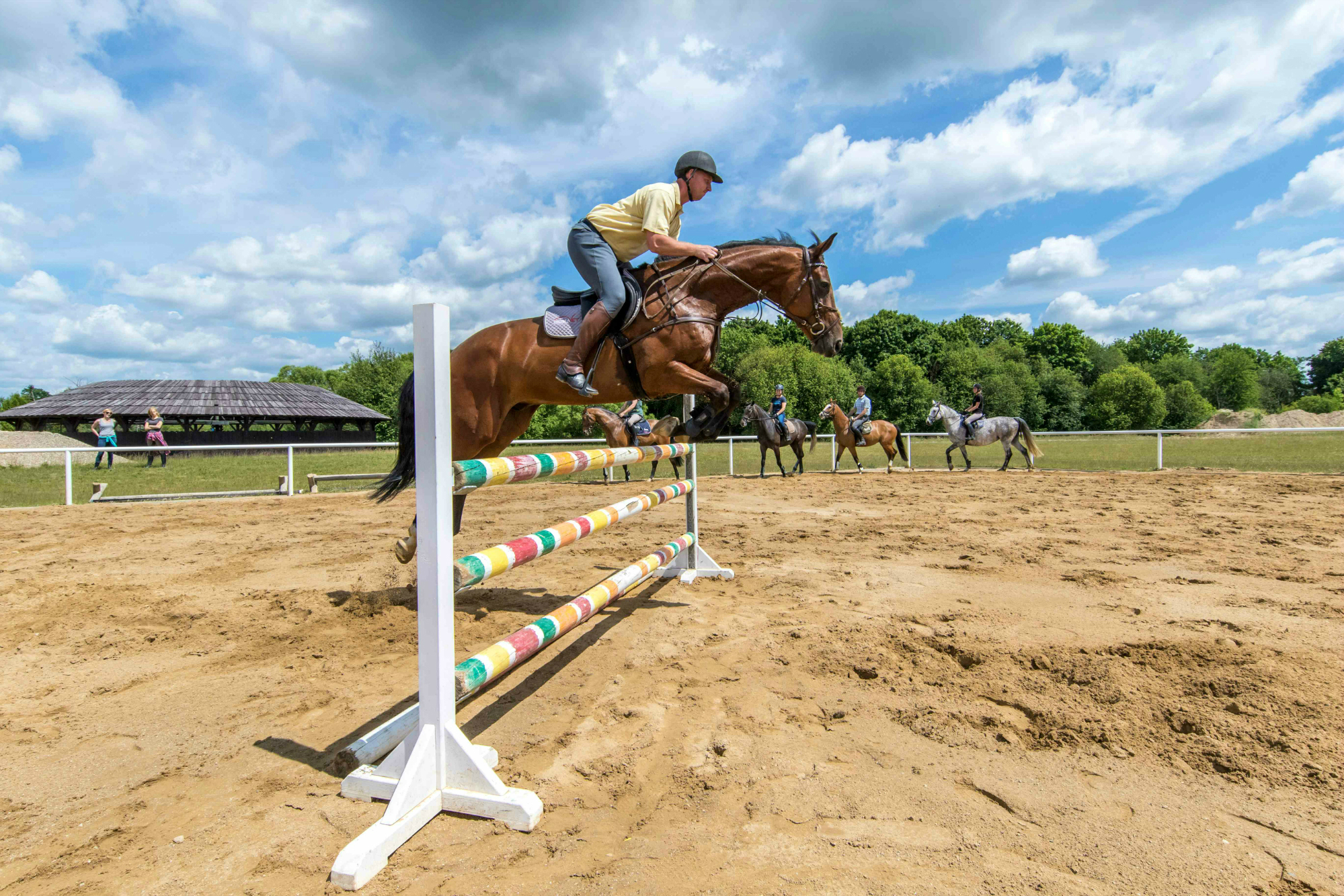 Lekcje jazdy konnej dostosowujemy do poziomu gości. Proponujemy: jazdy na lonży, placu maneżowym, w hali oraz jeśli warunki atmosferyczne pozwolą również w terenie.Pakiet nie obejmuje lekcji skokowych.